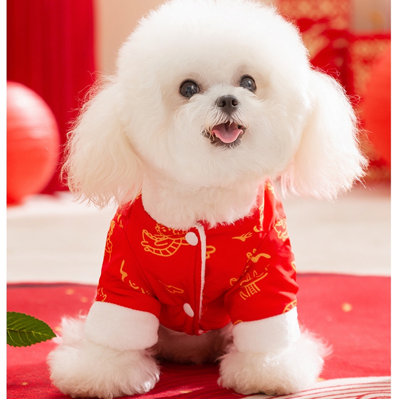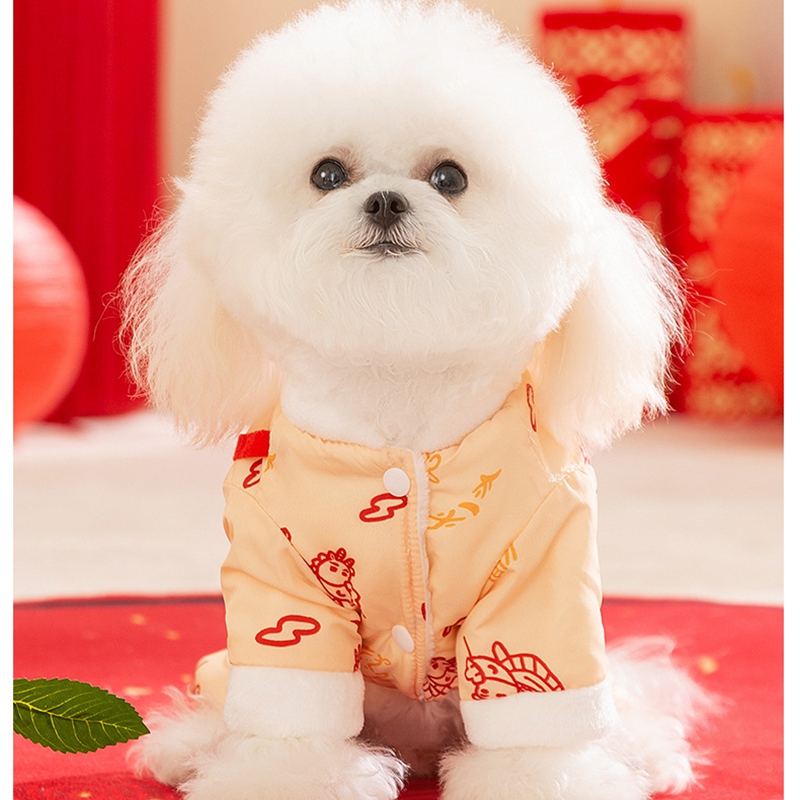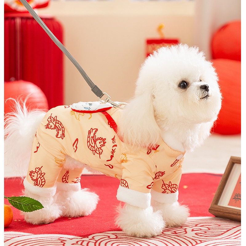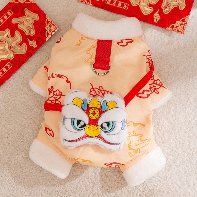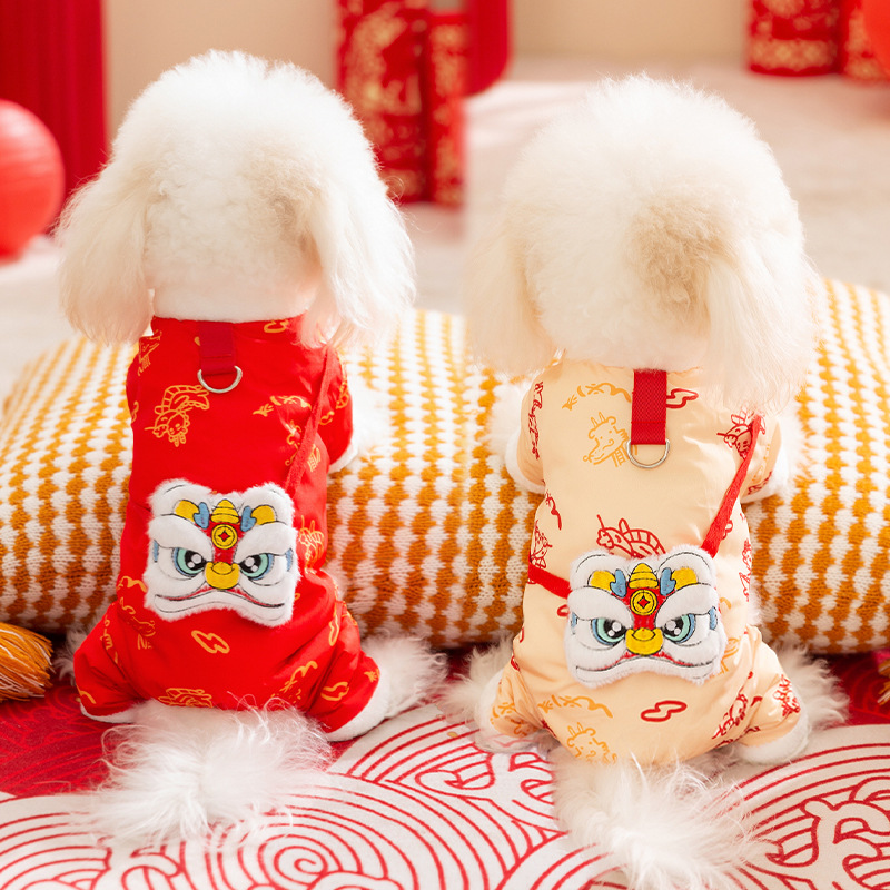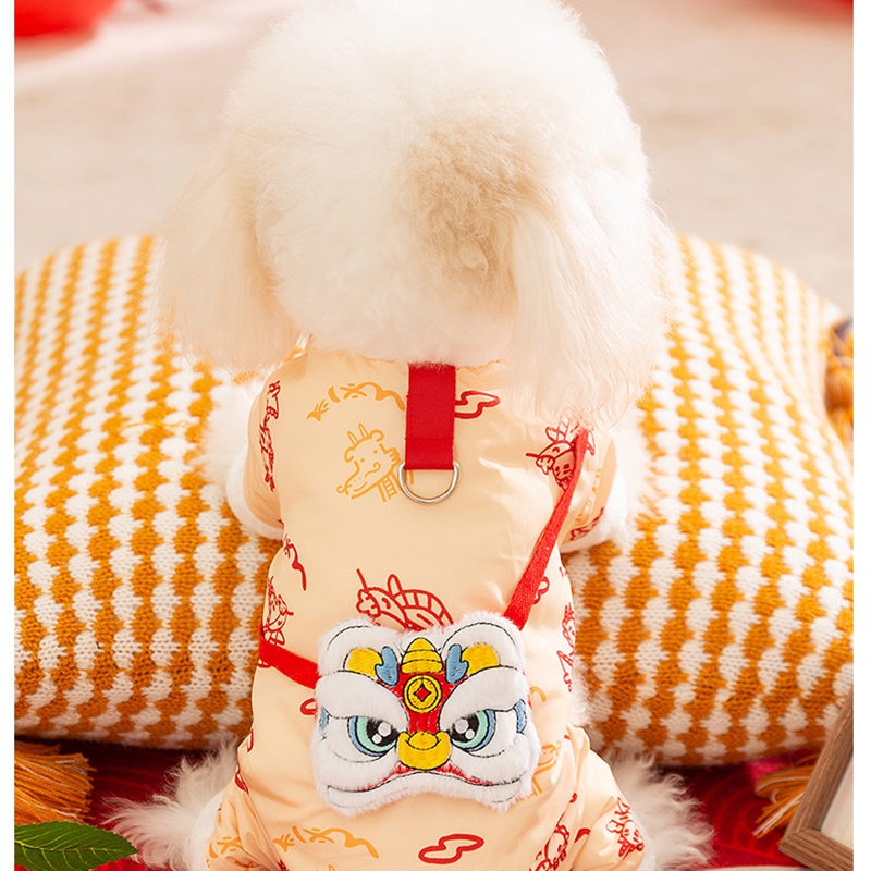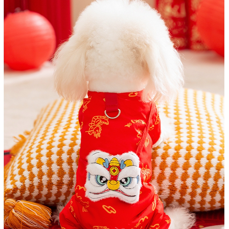 Celebrate Lunar New Year in authentic style with this Lion Dance Pet Jumpsuit! Available in vibrant red and elegant beige, each jumpsuit features intricate lion dance embroidery, traditional Chinese patterns, and a plush faux fur trim for cozy warmth. The integrated leash ring adds practicality for walks, while the playful lion head detail and festive color palette embody prosperity and cultural heritage. Perfect for Lunar New Year gatherings or festive photoshoots, this jumpsuit combines traditional craftsmanship, functional design, and eye-catching charm—ensuring your furry companion stands out with Lunar New Year elegance and stays snug during celebrations.