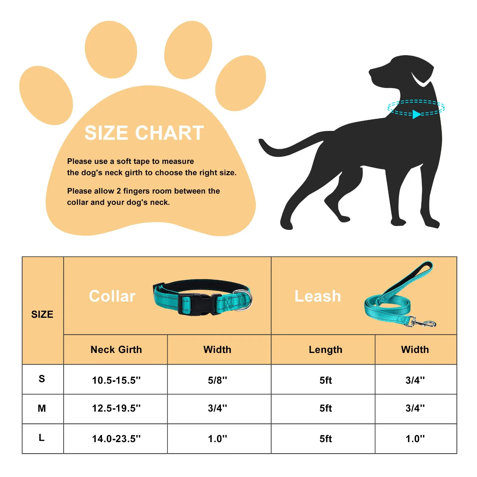 Jumpress Reflective Dog Collar and Leash set, Durable Padded Large Dogs Collar and 5ft Leash, Teal,L