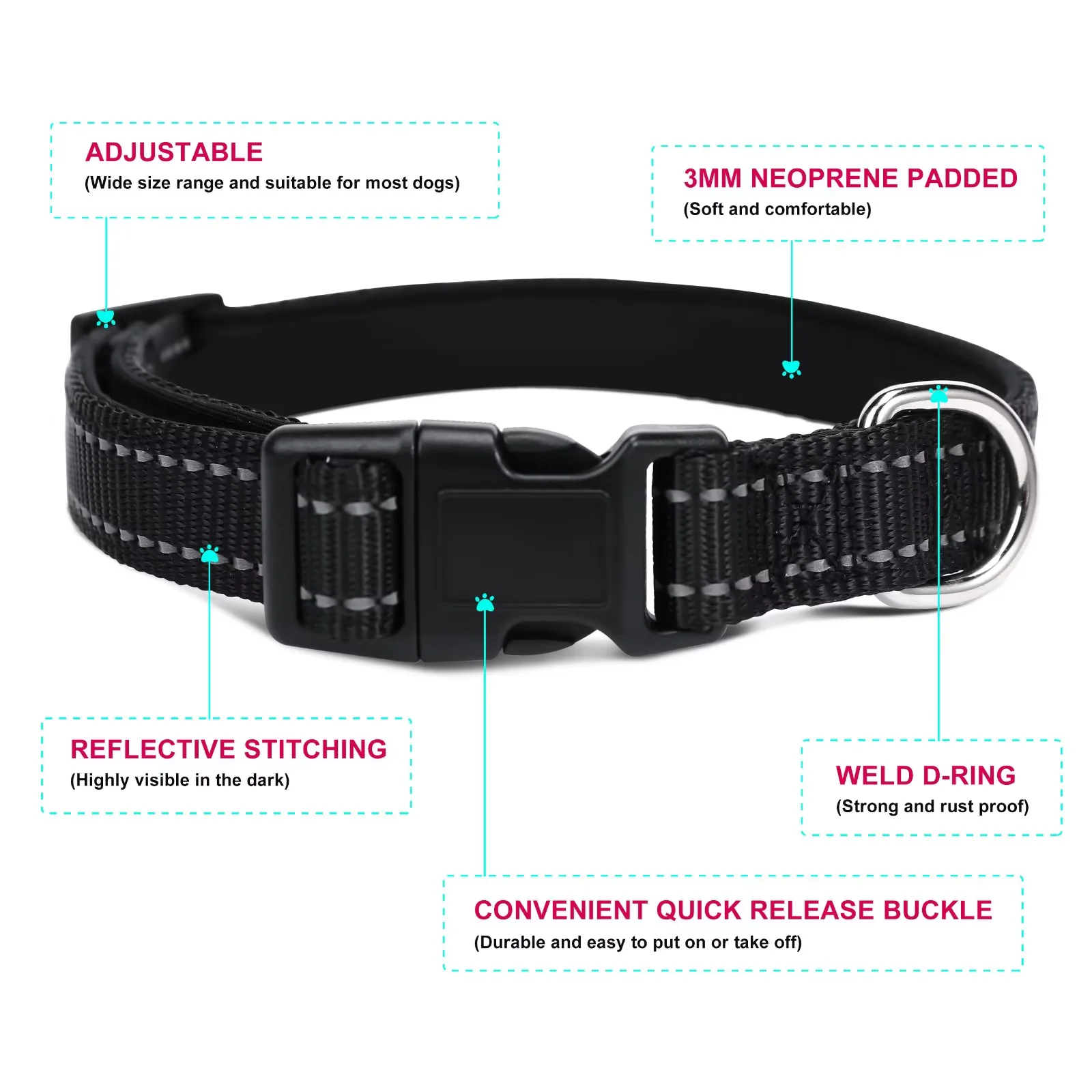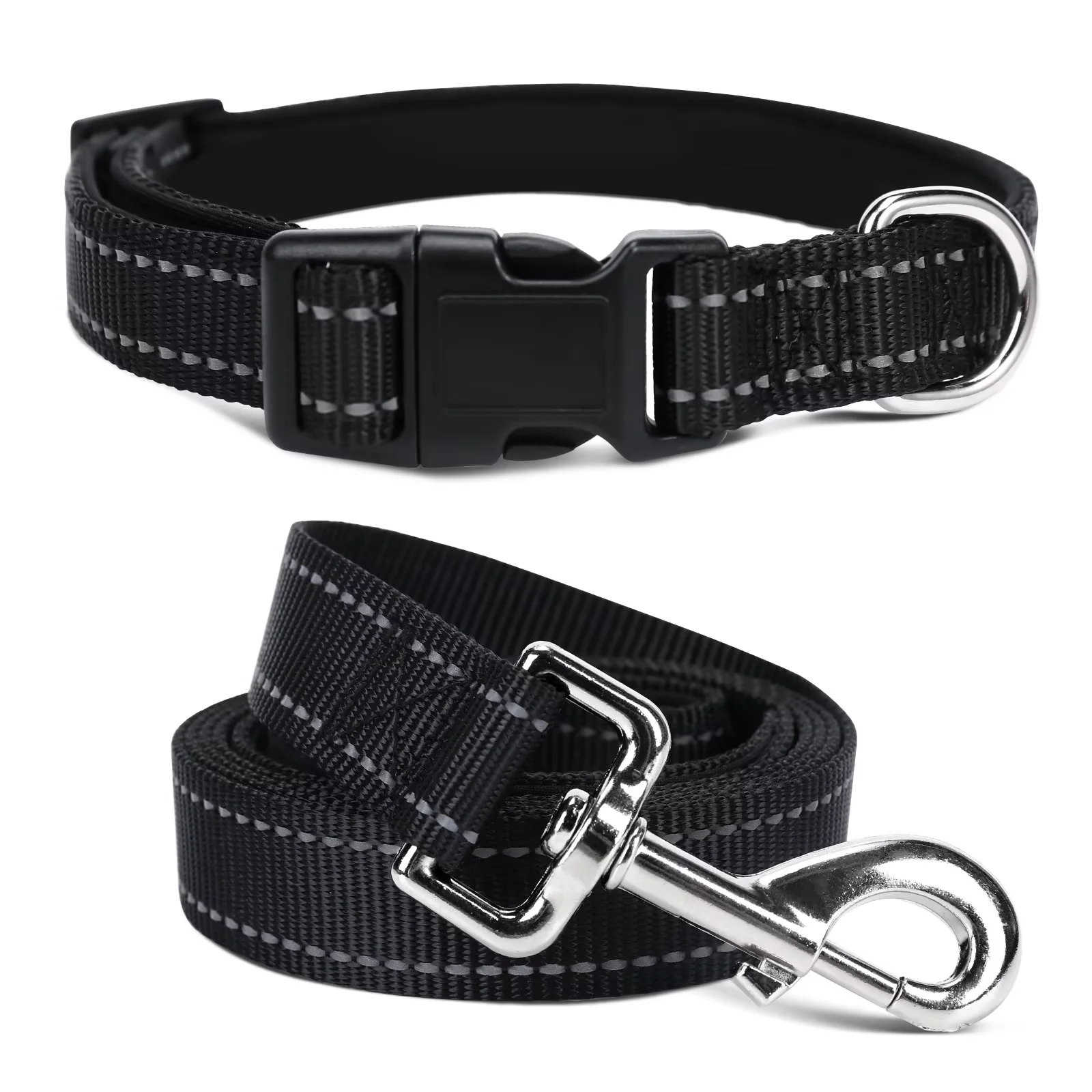 Jumpress Reflective Dog Collar and Leash set, Soft Padded Medium Dogs Collar and 5ft Leash, Black,M