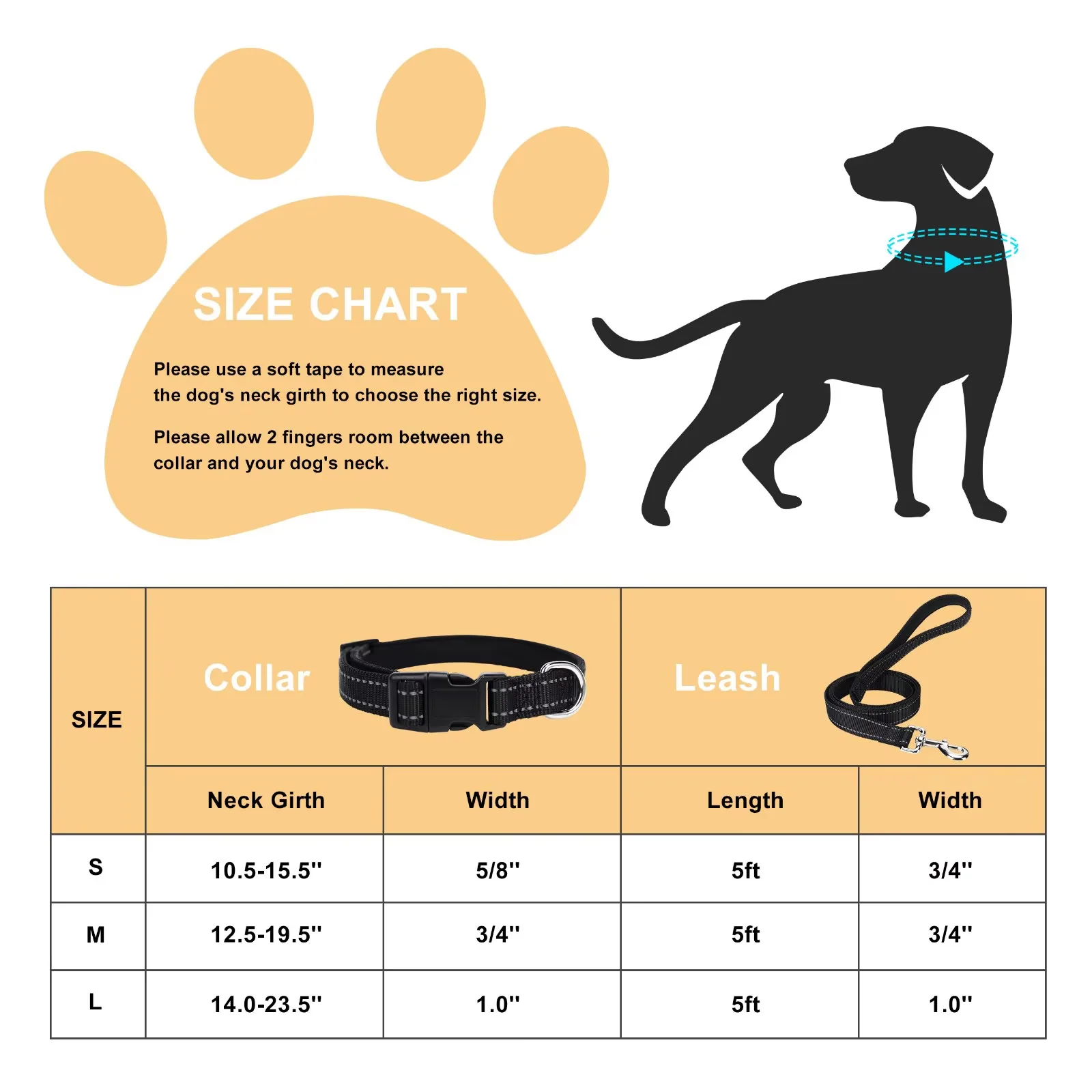 • Durable Dog Collar and Leash Set — Our reflective dog collar and leash set is constructed with premium strong double layer nylon webbing, Washable, Non-fading, Durable, Lightweight, Silky touch, bring ultimate comfort to your dog, Perfect for everyday use