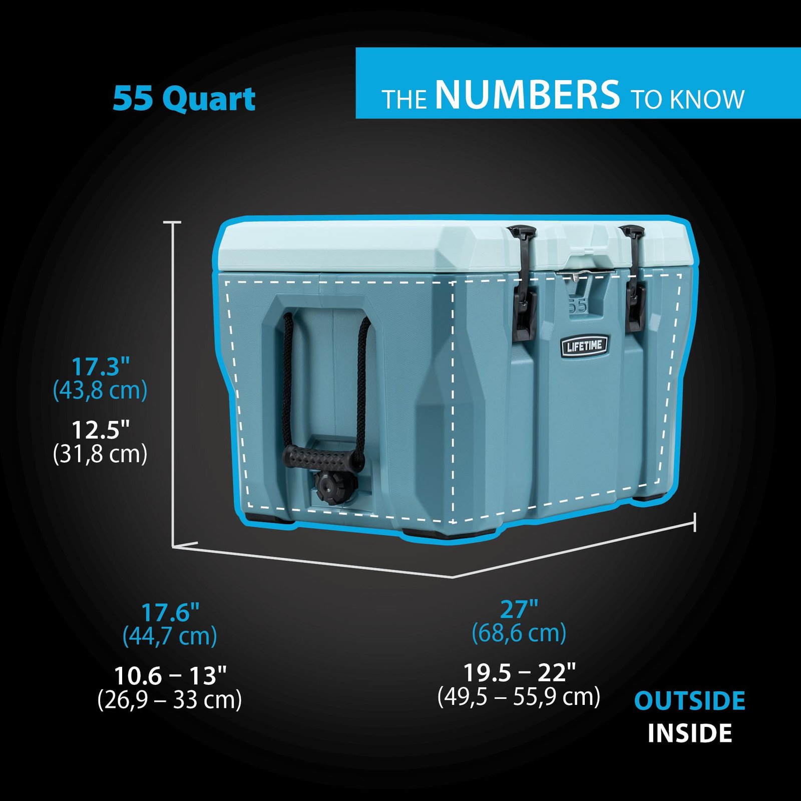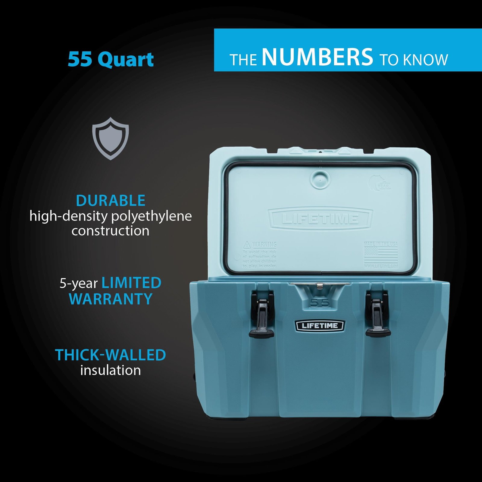 The Lifetime High-Performance 55 Qt Cooler is perfect for anywhere you want to go. Its performance exceeds most premium-priced coolers both in strength and in the all-important ice retention. With an insulated lid and body that provides strength, protection, and insulation, the Lifetime Cooler is light enough for everyday use, solid enough to keep your ice cold, and durable enough to go anywhere you go. With a 5-year warranty, up to 7 days ice retention, and room for 60 cans with ice, the Lifetime Cooler will more than stack up with the competition.