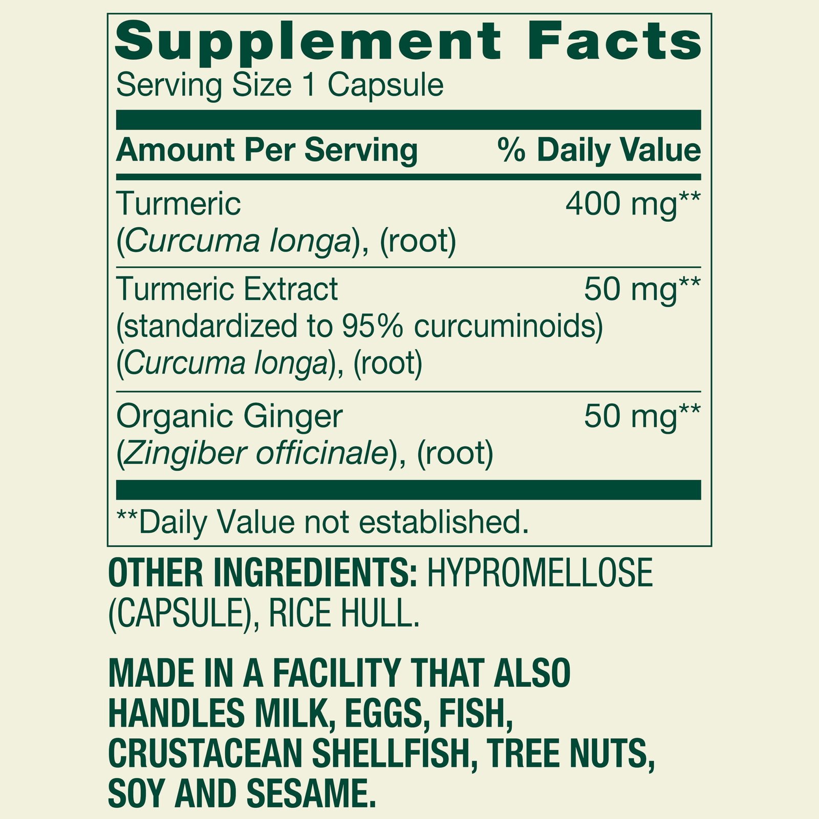 Spring Valley Turmeric Curcumin with Ginger Powder Dietary Supplement Vegetarian Capsules are a dietary supplement that promotes general wellness and supports a healthy inflammatory response while supporting cardiovascular, immune, joint, and skin health.* Each vegetarian capsule contains 400 milligrams of turmeric powder, 50 milligrams of turmeric extract, and 50 milligrams of organic ginger powder. The suggested adult dosage is one vegetarian capsule twice daily, preferably with meals. These capsules are free of milk and milk derivatives, lactose, and sugar. They also contain no preservatives, artificial colors, or artificial flavors. Supplement your healthy lifestyle with Spring Valley Turmeric Curcumin with Ginger Powder Dietary Supplement Vegetarian Capsules.