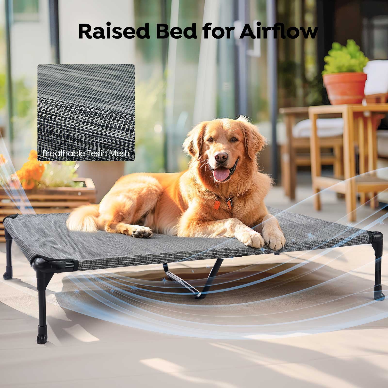 The raised dog bed is composed of Powder-Coated Steel tube, anti-scratch Teslin mesh, and the non-slip rubber feet.